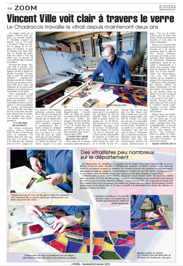 Article réalisé en Aout 2018 par l'éveil de la Haute loire concernant la fabrication d'un vitrail pour l'église de Saint Préjet d'Allier représentant l'assomption de la vierge marie. Vitrail réalisé dans les règles de l'art, avec du verre de la verrerie de saint Just saint Rambert. La barlotière ainsi que la grille de protection on étés réalisés par l'entreprise Forge Art Elementa Frédéric Martin (agrée Monuments Historiques) à la ZA de Polignac.